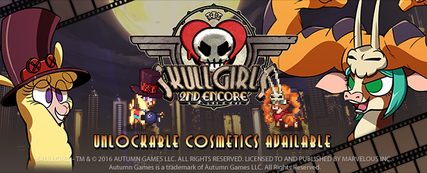 Owners of Skullgirls 2nd Encore on Steam automatically unlock exclusive cosplay items in the Pixel Lobby for all characters: Cerebella's Hat Vice Versa, Peacock's Hat, and Bomb minion George.