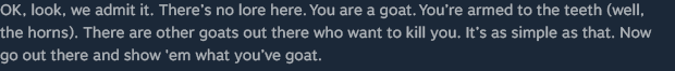 - Goats. You are an armed goat fighting other goats. It doesn’t get any better than that!
